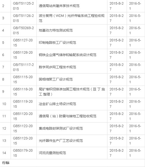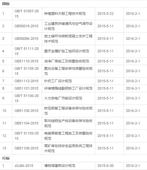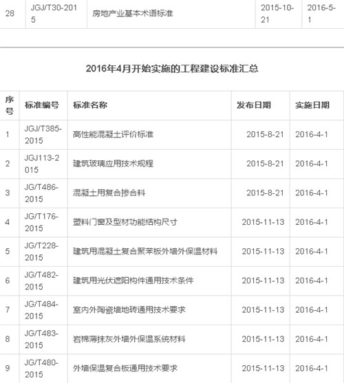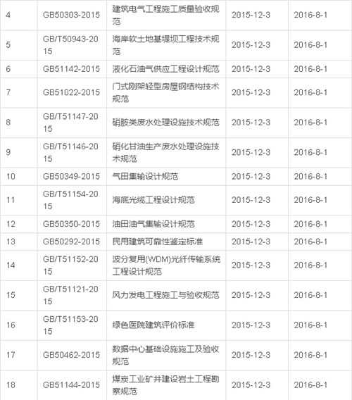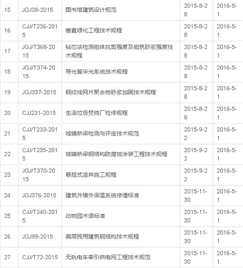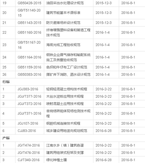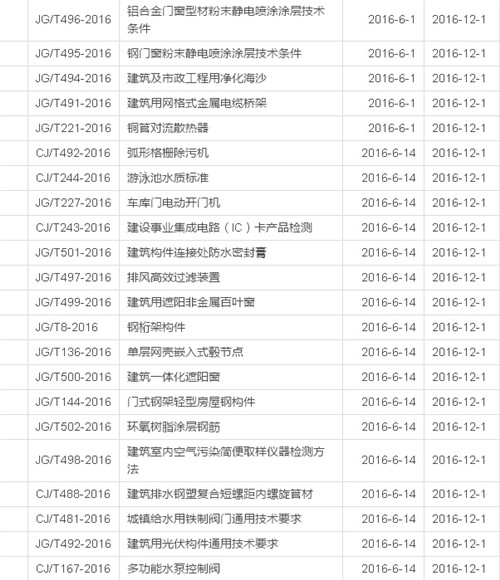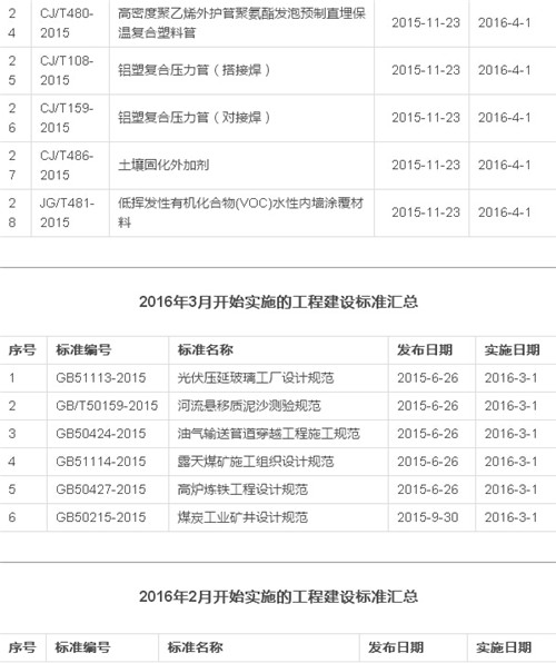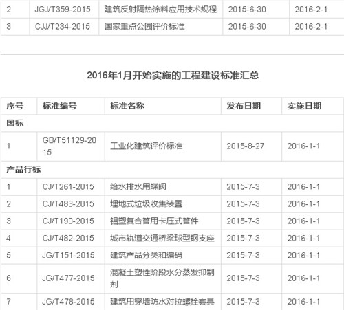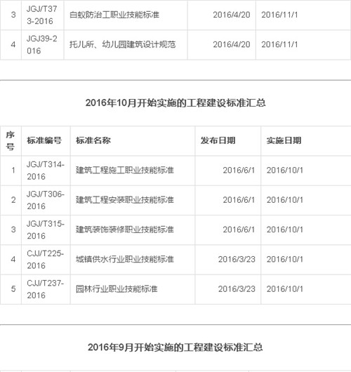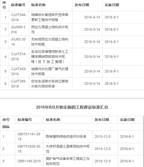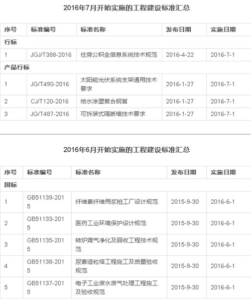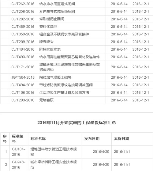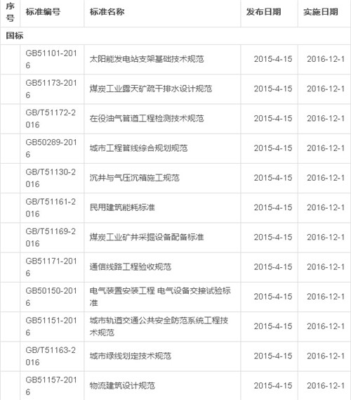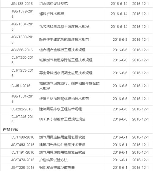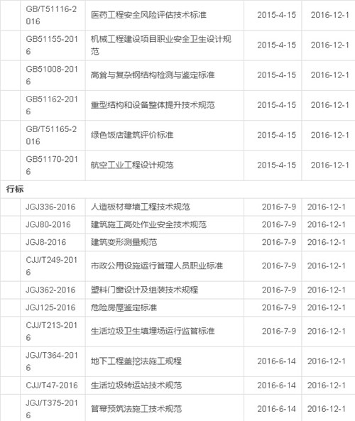 2016年12月开始实施的工程建设标准汇总