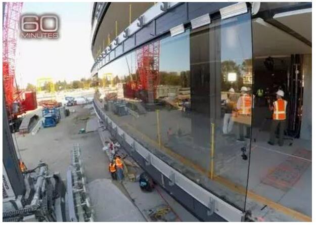 正在安装新总部大厦曲面玻璃的施工设备。