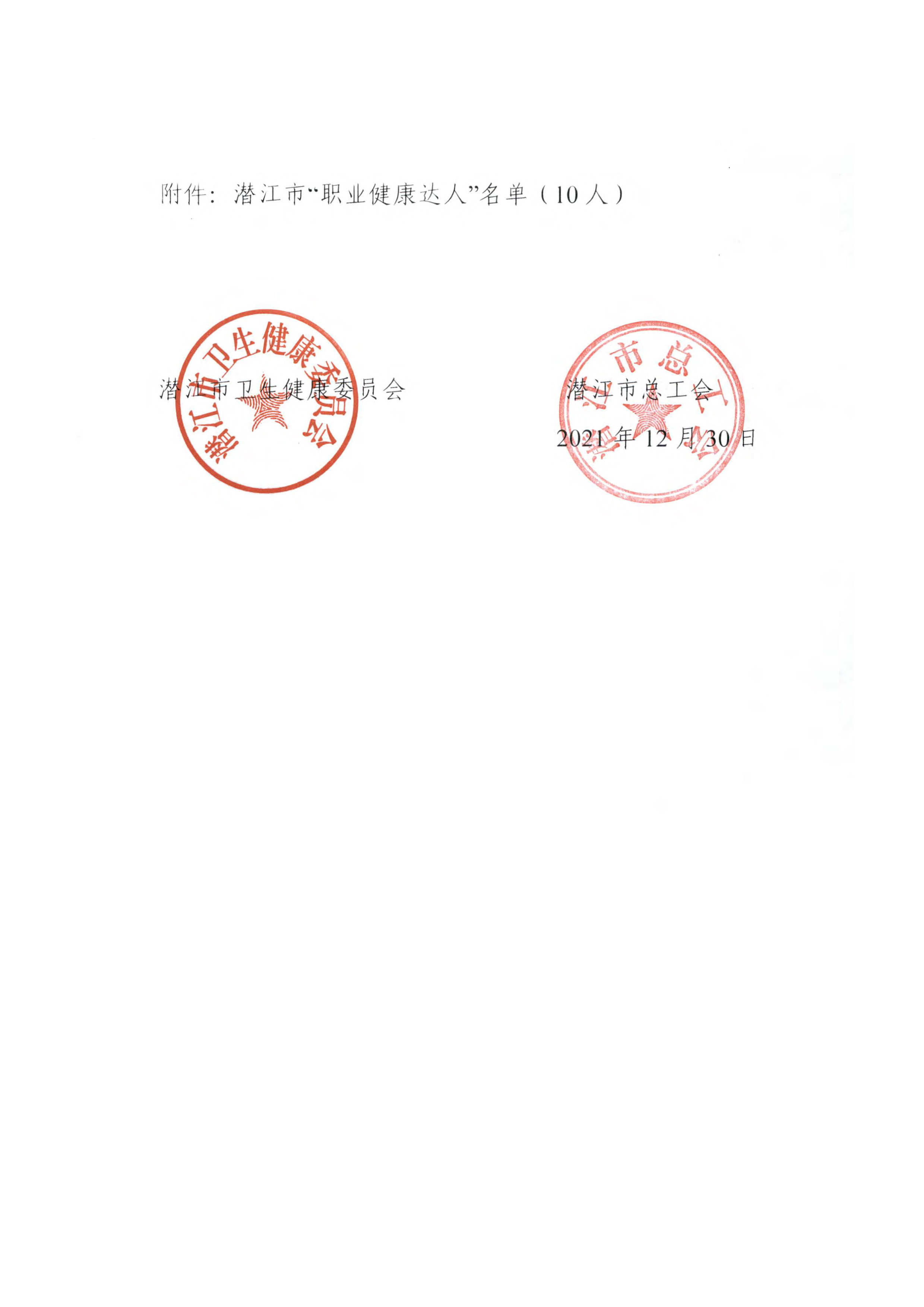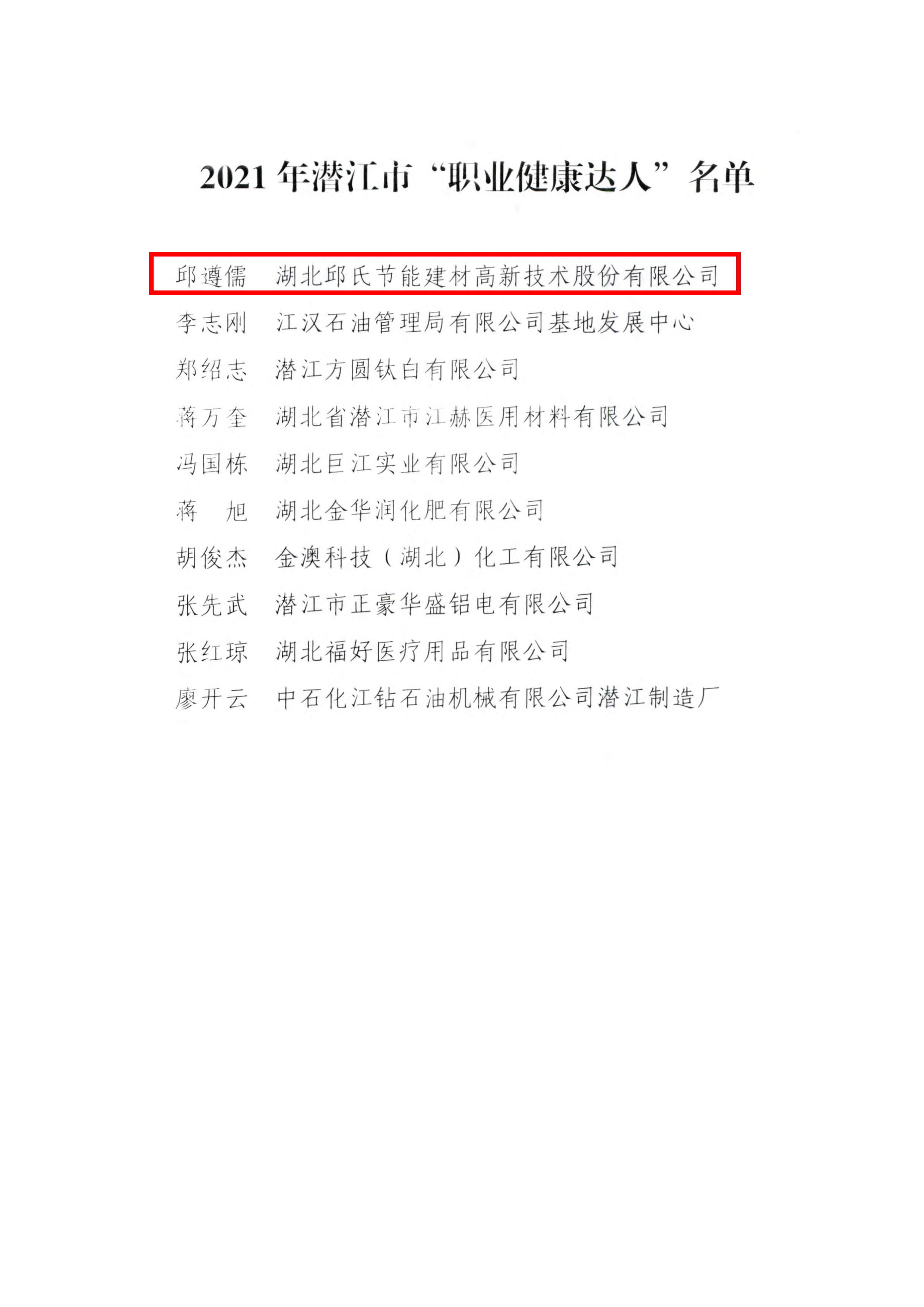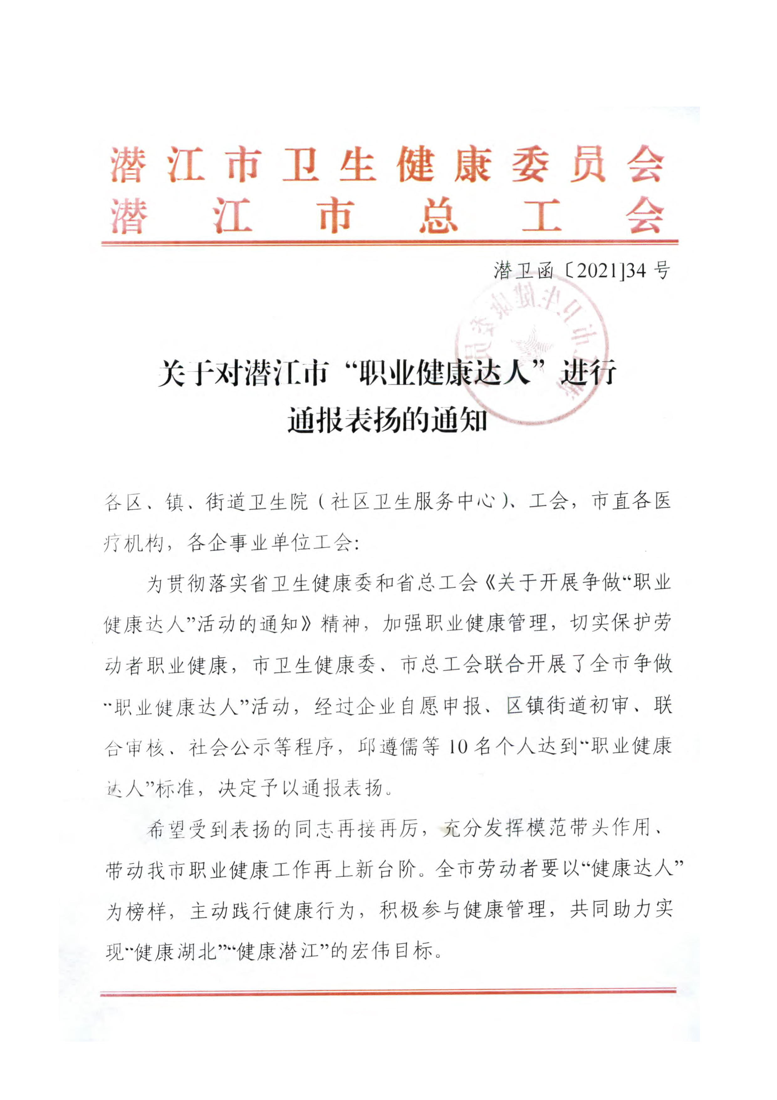 关于对潜江市“职业健康达人”进行通报表扬的通知